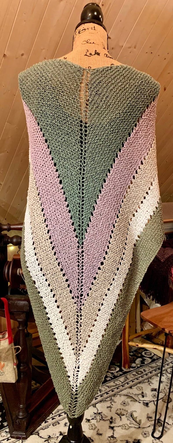 "Kilino" hand-knit shawl. Garter stitch and eyelet pattern.