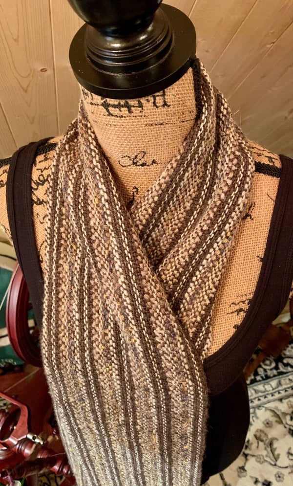 Approximately 7' long (including length of fringe on each end), 6.5" wide; 30% handspun wool (Shetland Corriedale, Lincoln), 10% acrylic, 5% nylon, 5% polyester warp; 50% handspun wool (Shetland Corriedale) weft.
